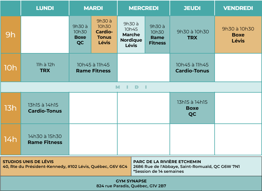 Tous les cours en présentiels offerts par la Clinique Synapse, sur la Rive-Nord et la Rive-Sud de Québec!